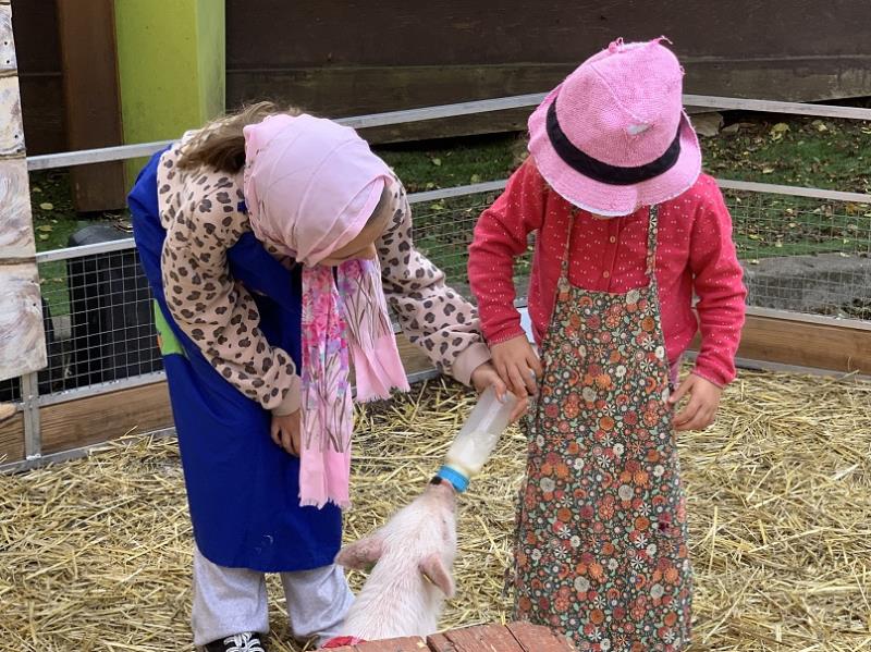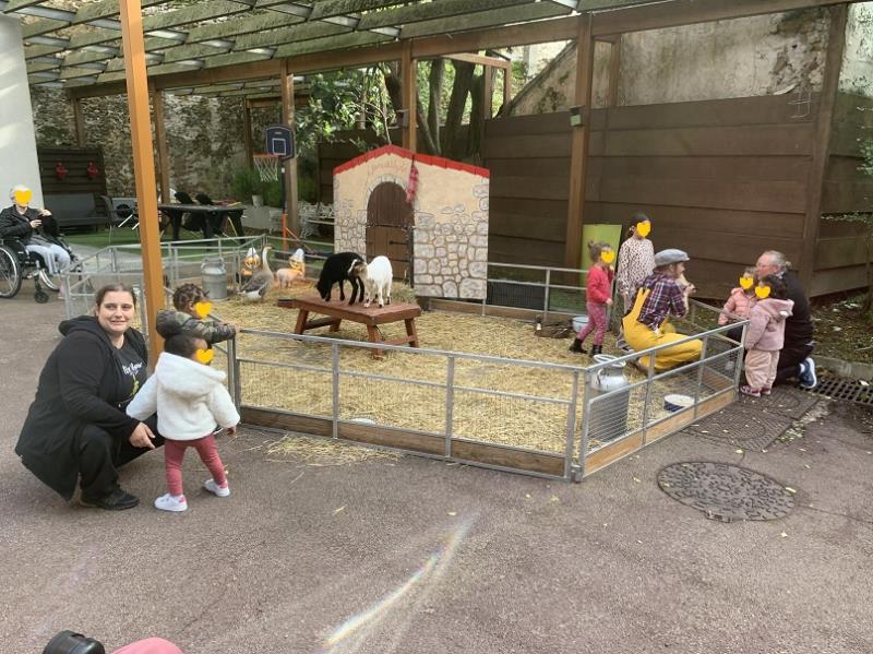 Des enfants du centre de loisirs Esclangon, des petits de la crèche "Frimousse et enfantill'ages" ainsi que des arrières petits enfants de résidents ont pu rentrer dans l'enclos, voir de près, caresser et même se mettre dans la peau de fermiers en donnant le biberon à certains animaux !