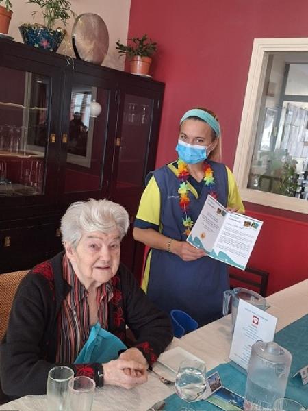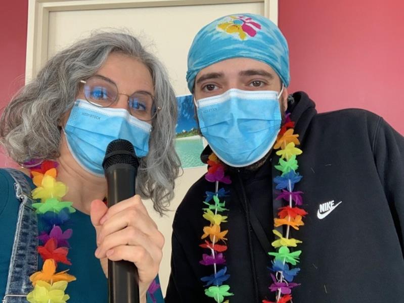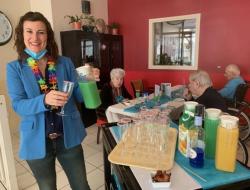Avec la complicité de la "Team soins" qui a participé à habiller les résidents qui le souhaitaient, en bleu, toute l'équipe du personnel de Médicis a arboré un collier de fleurs et/ou une tenue bleue.