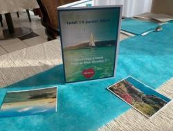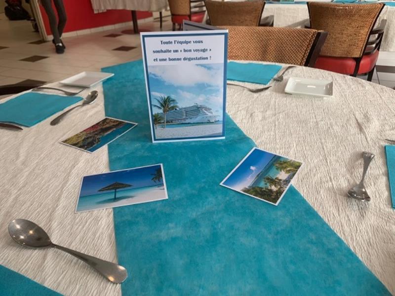Pour l'occasion : une mise en place spéciale pour le restaurant, les tables ont été dressées en bleu turquoise, agrémentées de photos de paysages de mers chaudes.