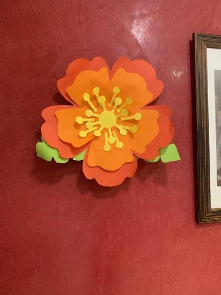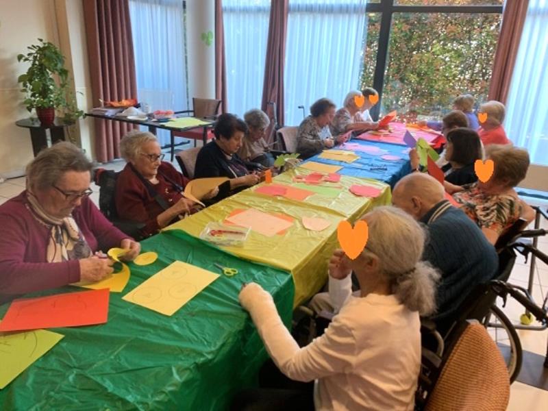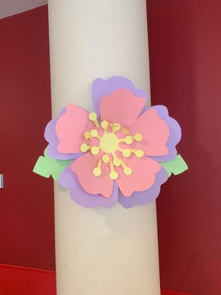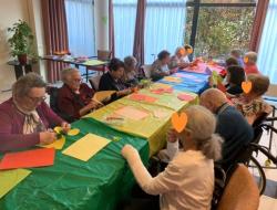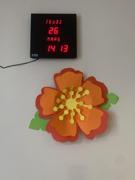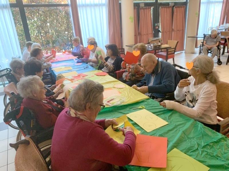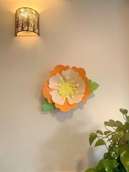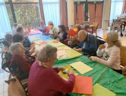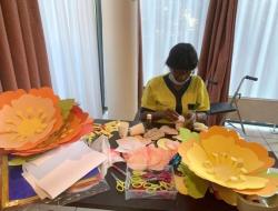 Pendant un atelier créatif, les résidents se sont amusés à fabriquer de grandes fleurs en papier, qui sont venus décorer les murs de la résidence. C'est toujours une fierté d'être à l'origine de la décoration des espaces de vie.